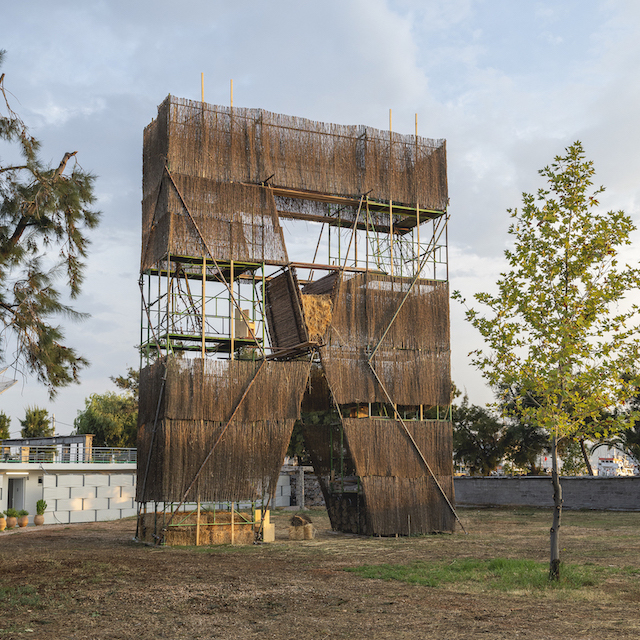 The starting point for the sculptural installation “Straw falling on concrete floors” is the mythological and historical tradition of Elefsina and it is part of a larger study on the tectonic composition of animism. The goddess Demeter and her daughter, Persephone, offer the ideal narrative for the merging of the inorganic with the organic element and how seemingly different entities and physical phenomena, defined by movement or immobility, animate and inanimate matter, flourishing and withering, can overlap and not work in opposition.The architectural scale of the construction connects the notion of moira as protractor measurement unit with the notion of moira as destiny and luck. The stakes of this upright and vertical anthropomorphic field do not only concern the surface of the earth and the height of a “wind-friendly”( Anemophily ) structure, but also address a reverse course, where height can be understood as an ultimate depth. All the agricultural activities that Demeter (earth mother) takes care of by ploughing, sowing and harvesting, also involve the chthonic element. Persephone and her stay in Hades for some months of the year reflect the continuation of a permanent existential narrative with the natural life cycle of plants as a symbol of birth, death and rebirth.
